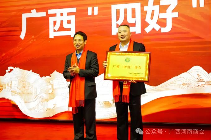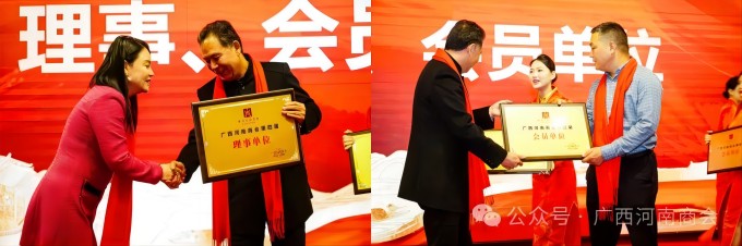 會上自治區工商聯黨組成員、副主席、秘書長賓建光給廣西河南商會頒發了廣西“四好”商會牌匾,永久榮譽會長李衛國為2024年常務副會長彭新文、張海濤頒發牌匾,名譽會長吳光明為理事敬茹,會員辛曙光頒發牌匾。