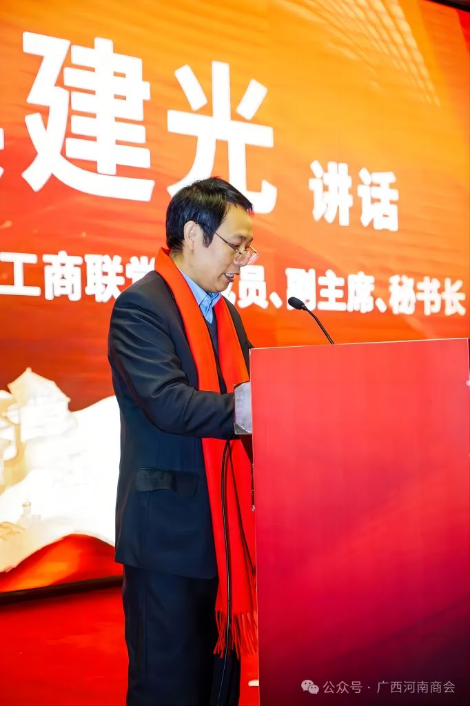 自治區工商聯黨組成員、副主席、秘書長賓建光發表講話時,對本會2023年所取得的成績給予高度肯定,他希望廣西河南商會在劉泉峰會長的帶領下,繼續發揚成績,開拓創新,為廣西的經濟和社會發展做出更大的貢獻。
