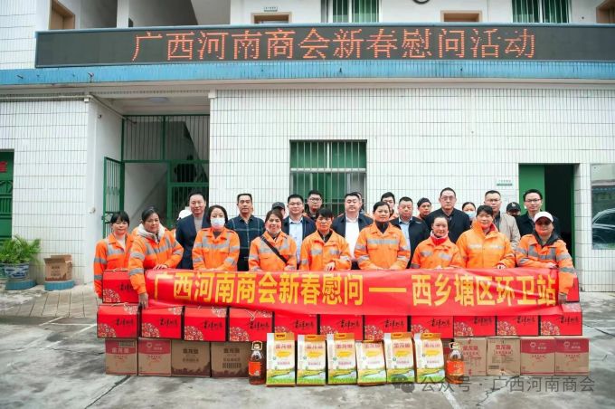 西鄉(xiāng)塘區(qū)城管局副局長兼環(huán)境衛(wèi)生管理站站長杜家文,環(huán)境衛(wèi)生管理站黨委書記李仕奎及工作人員和眾多環(huán)衛(wèi)工人,對慰問團的到來表示熱烈的歡迎和衷心感謝!李仕奎表示:廣西河南商會組團慰問一線環(huán)衛(wèi)站工人,是對環(huán)衛(wèi)工作的強力支持和對廣大工人的濃愛,將激勵環(huán)衛(wèi)工人永葆初心,為城市高質量發(fā)展貢獻力量!