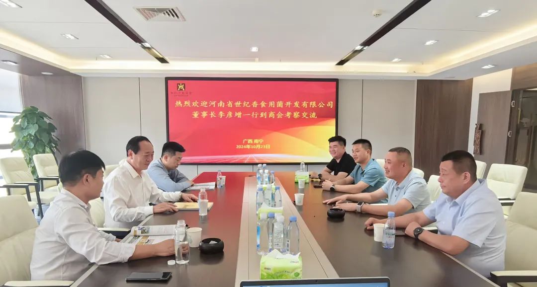 9月30日,身兼河南省投資促進局駐東盟聯絡處主任、廣西河南商會會長、廣西豫桂聯盟實業有限公司董事長劉泉峰帶領廣西河南商會副會長單位企業家商務考察團前往河南許昌世紀香食用菌產業園,考察現代農業產業項目,開展商務合作交流活動。