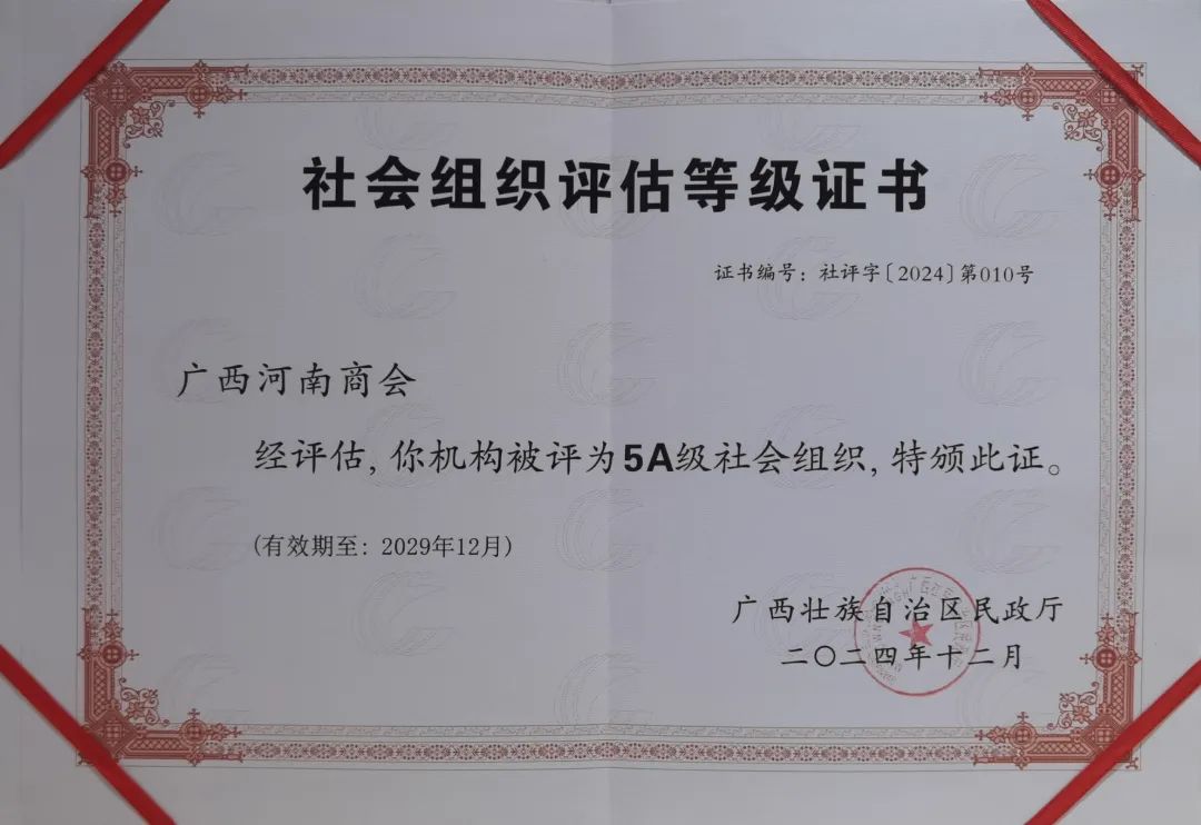 熱烈祝賀廣西河南商會(huì)榮獲5A級(jí)社會(huì)組織殊榮