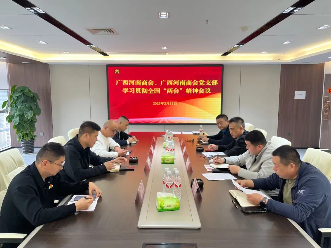 本會訊 全國“兩會”剛閉幕不久。3月13日下午,廣西河南商會及商會黨支部就聯合召開會議,迅速學習貫徹全國“兩會”精神。受劉泉峰會長的委托,執行會長兼秘書長劉坤主持會議。常務副會長彭新文、黨支部書記、副會長杜華勇及第三輪值組成員和支部黨員、入黨積極分子等出席會議。