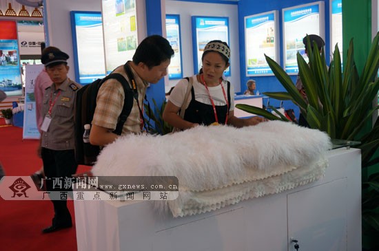 “灘羊皮”是寧夏五寶之一。記者在投資合作館寧夏展區見到了這一“寶貝”。參展商金先生對記者說:“‘灘羊皮 ’在寧夏當地被稱為‘二毛皮 ’。早在10年前,‘灘羊皮 ’被稱為‘軟黃金 ’,一張小原皮等于1克黃金的價格。去年一位做床上用品的泰國客商一次就定了20萬元的貨物。此后,平均每兩個月都和我們定10萬元的貨物。今年,依舊有很多人要購買‘灘羊皮 ’,但我們今年只展不賣。” 金先生的公司已經參加了四屆博覽會。他說:“我們到這里的目的就是想擴大企業規模,求合作。”